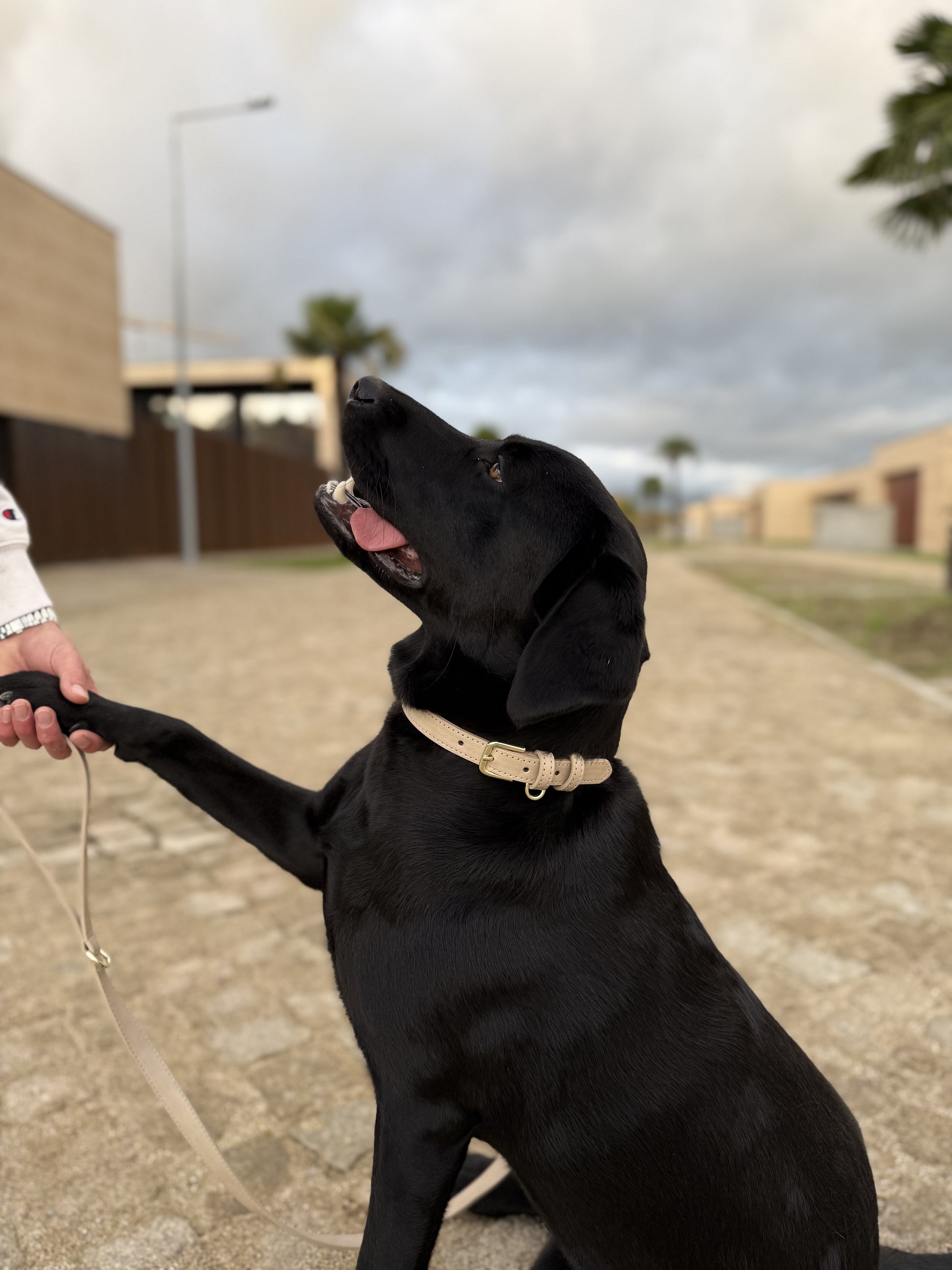 Um design elegante e sofisticado, produzido à mão em Portugal com couro sintético suave em tons pastel. Finalizada com hardware dourado de alta qualidade proveniente da Itália e uma pequena argola para pendurar medalhas, a nossa coleira é o equilíbrio perfeito entre estilo e funcionalidade.